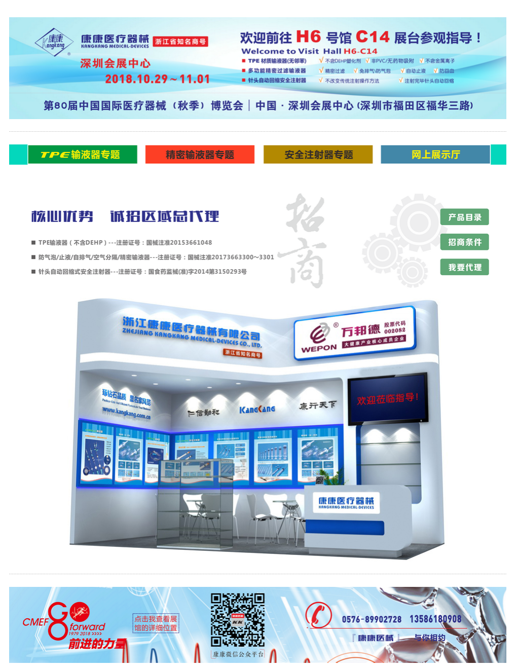 你好!第80屆中國(guó)醫(yī)療器械(秋季)博覽會(huì)CMEF2018AUTUMN將于10月29日至11月1日在深圳會(huì)展中心舉行,康康醫(yī)療器械將攜“多功能精密過(guò)濾輸液器”、“8微米膜式止液輸液器”等新產(chǎn)品參展(展位號(hào):6號(hào)館-C14),真誠(chéng)期待您的光臨。